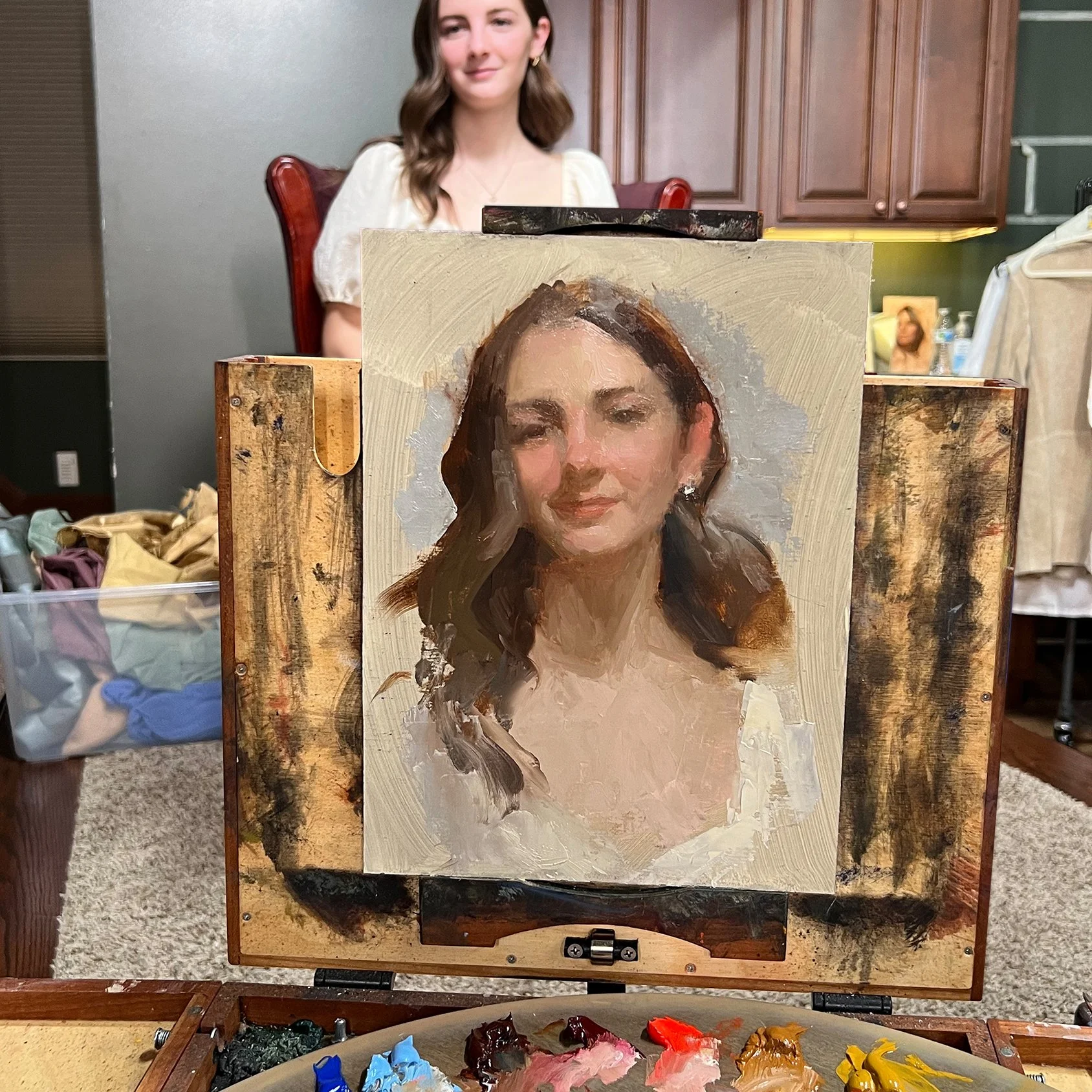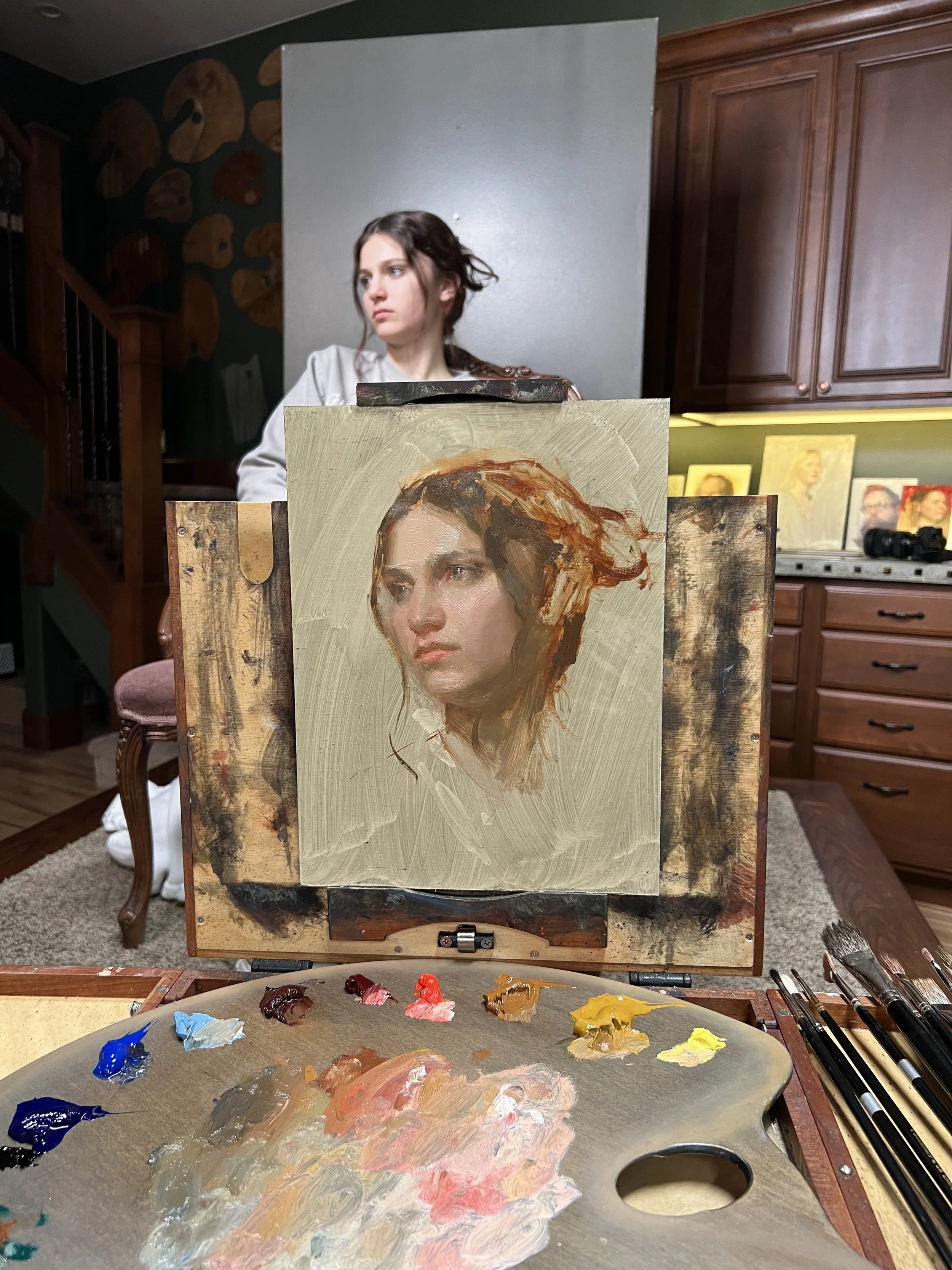 Mary and Casey will demonstrate together their approach to painting the portrait from life each morning of the workshop for 3 hours. In the afternoon, students will paint from the same model and Casey and Mary will alternate each day between walking around giving each person personal critiques and painting along with the class. Students will get to see how both Mary and Casey finish a portrait beyond a 3 hour sketch. Each day will have a different pose to allow students to practice by repetition correct drawing and value relationships while working from a life model. Students will have 4 different angles/poses to painting from during this workshop.